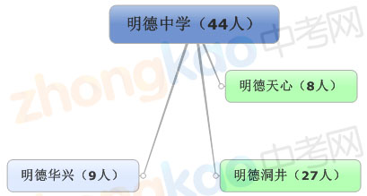 明德中学2013年对口直升生名额44人,分配给了三所学校,明德天心中学8人,明德洞井27人,明德华兴9人。大家可参见下图: