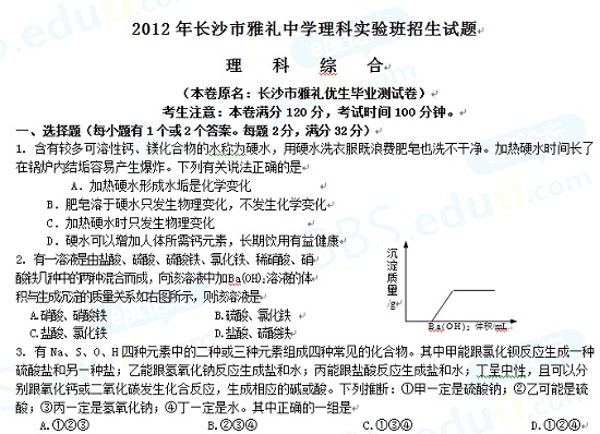 点击下载:2012年雅礼中学理科实验班招生考试理综试题