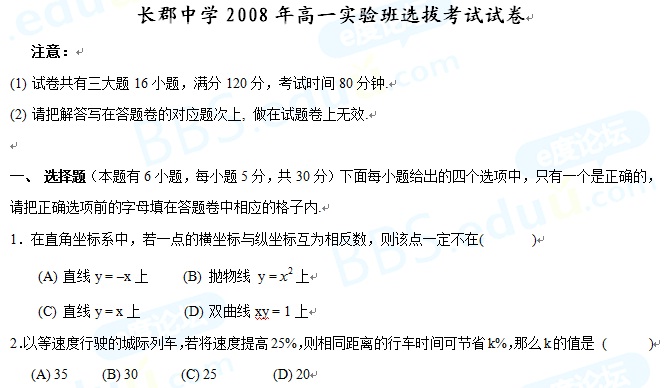 点击下载试题:2008年长郡中学高一实验班选拔考试试卷及答案