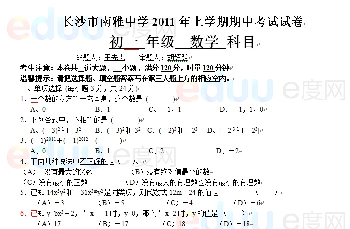 点击查看完整试卷:南雅中学2011年七年级上学期期中考试数学试卷