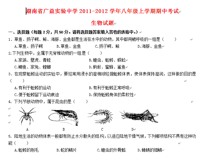 点击下载完整试题:广益实验中学2011学年七年级上学期期中考试生物试题