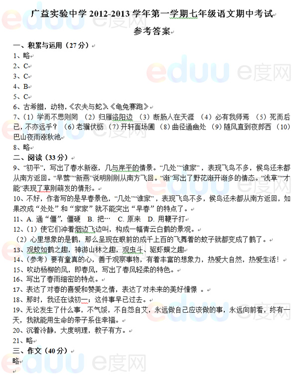 点击下载试卷:广益实验中学2012学年七年级上期中考试语文试题