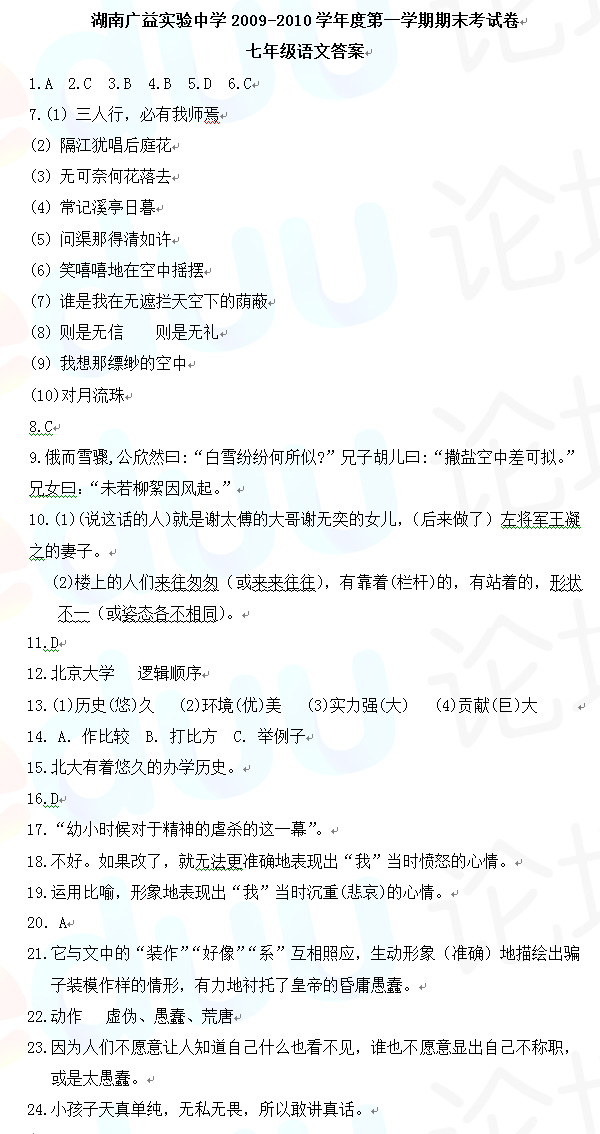 点击下载试卷:广益中学2009-2010年七年级上学期期末语文试卷