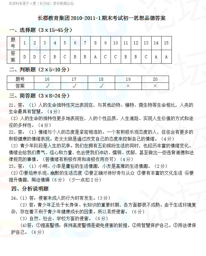 长郡教育集团2010-2011-1期末考试初一政治答案