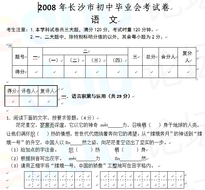 点击下载完整试卷:2008年长沙市中考语文试卷