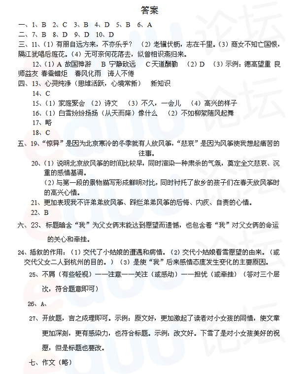 广益实验中学2010-2011学年七年级上期末考试语文试题答案