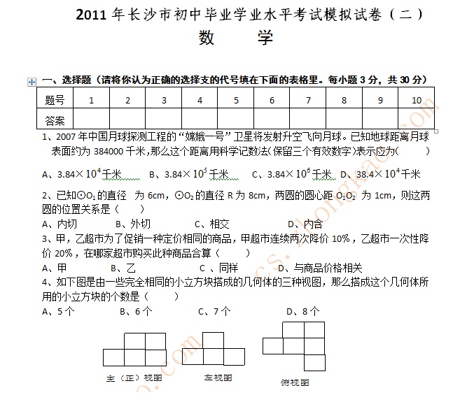 2011年长沙市初中毕业学业水平考试模拟试卷(二)数学