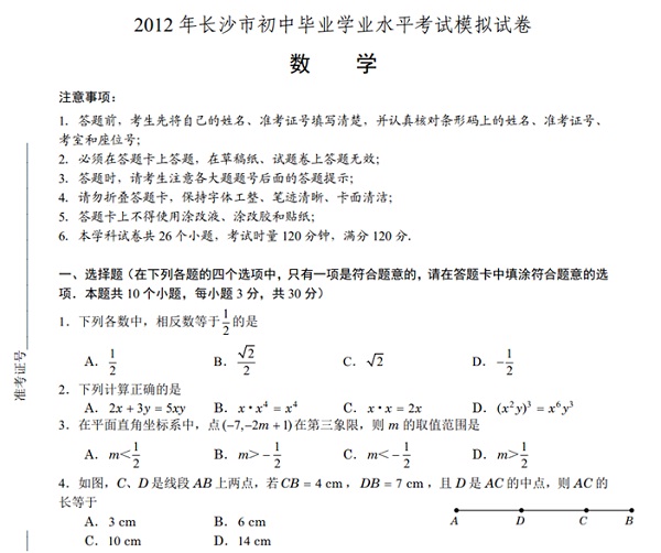 2012年长沙市初中毕业学业水平考试模拟试卷数学(三)