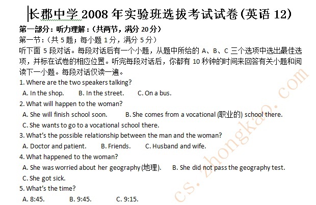 2008年长郡中学高一理科实验班考试英语试卷及答案