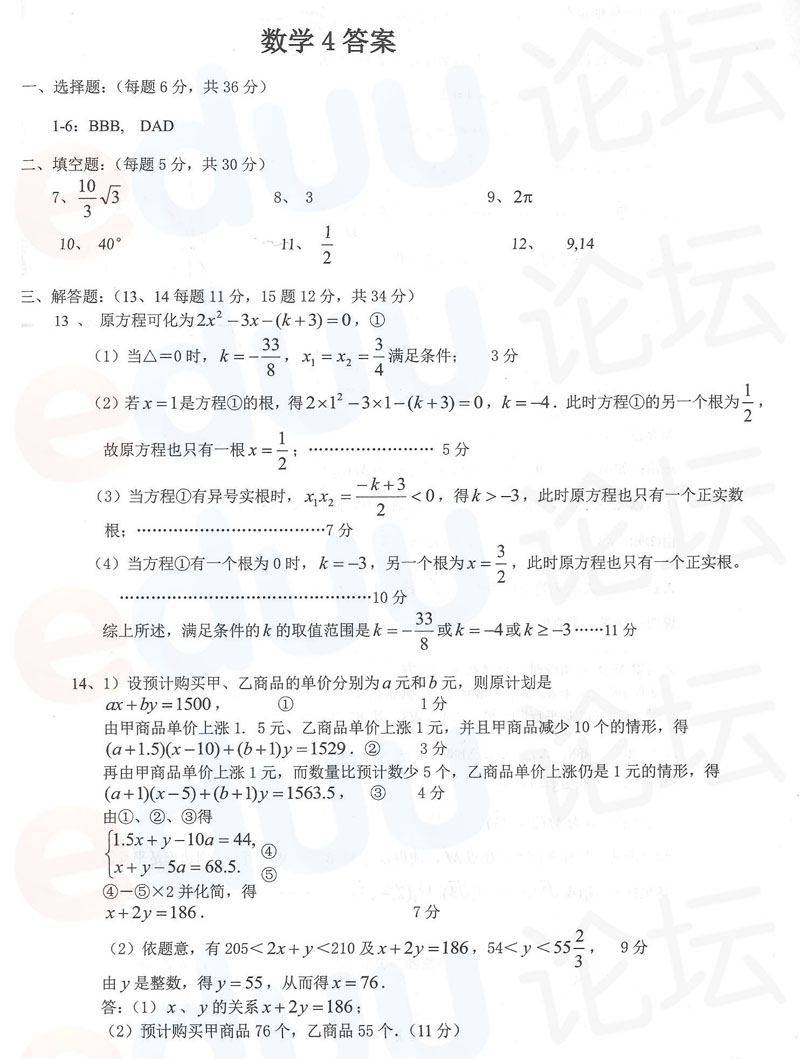 2013年长郡中学理科实验班考试数学密卷(4)答案
