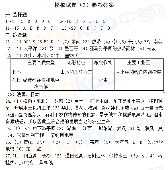 2012年长沙四大名校地理联考模拟试题(2)答案