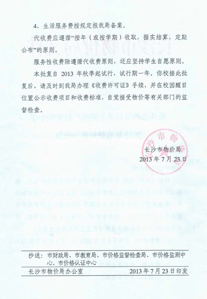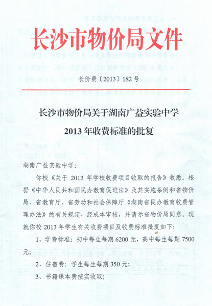 附:长沙市物价局关于湖南广益实验中学2013年收费标准的批复