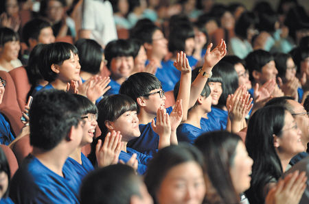 在欢快的音乐和同学们的欢呼声中,主持人孙小梅、撒贝宁走上舞台。“央视的主持人走到了我们中学生身边,说起中学生共同的话题,就像和我们聊天一样,我觉得他们特别有亲和力!”长郡中学学生方云汉说。