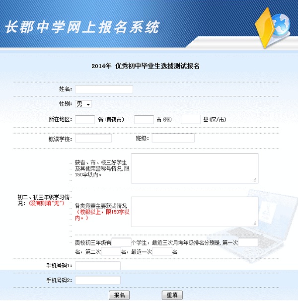 长沙中考网:近日,长郡中学开通了2014高一新生网上报名通道,想报考长郡中学实验班的同学们注意报名了。