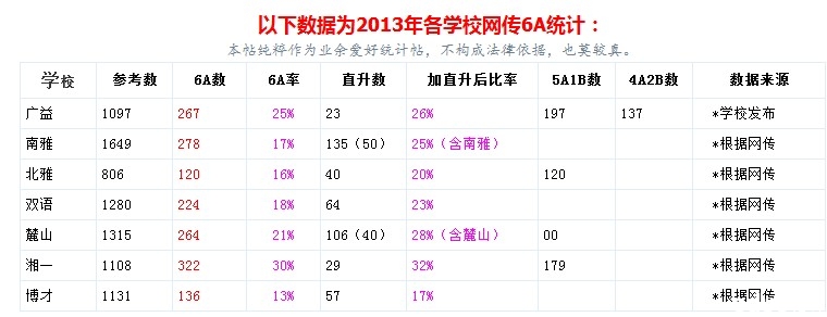 从以上列表来看,4校初中毕业能够进行4大名校+麓山+南雅高中读书的比例在42(广益)-50(麓山)%之间。麓山和南雅的优势在于这两个学校不仅可以直升本部高中,而且均有自己的高中,更重要的是在2013年这两校的高中部高考成绩斐然,所以对学生来说还是很有吸引力。而湘一的优势则在于一中旗下初中学校基本上就仅以湘一为主,没有其它的分校来分享一中的名额,虽然一中2013高考遭遇滑铁卢,但他百年名校的实力绝不是一次高考就能够轻视的;而且湘一在直升+6A的比率多年来一直在长沙的初中高居榜首,所以即便它本校没有高中,而初中毕业后进4+2校高中部的比例并不低(仅低于麓山1个百分点,49%)。