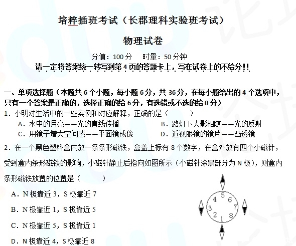 长沙中考网:2013年长郡中学理科实验班入学考试物理试卷。 查看完整试题请点击下载:2013年长郡理科实验班物理试卷.doc 点击下载答案:暂无答案 更多试题:决胜2013长沙中考!论坛试题资料大汇总(不断更新)