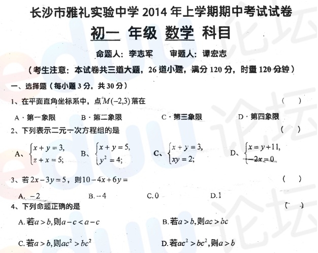 点击下载完整试题:雅礼实验2013-2014-2期中考试初一数学试卷及参考答案.doc 【查看原帖并参与讨论:雅礼实验2013-2014-2期中考试初一数学试卷及答案】