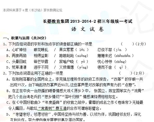 【查看原帖并参与讨论:长郡教育集团2013-2014-2期中考试初三语文试卷及答案】