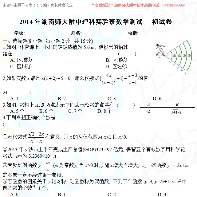 【查看原帖并参与讨论:2014年湖南师大附中理科实验班考试数学初试试卷及答案】