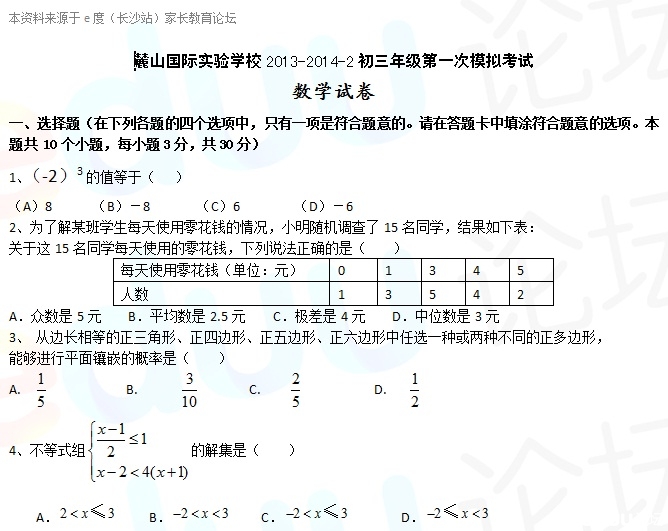 【查看原帖并参与讨论:麓山国际实验学校2013-2014-2初三第一次模拟考试数】