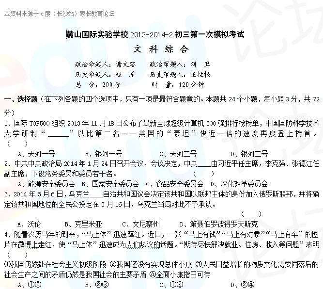 试题下载入口2:麓山国际实验学校2013-2014-2初三第一次模拟考试文科综合试卷.doc