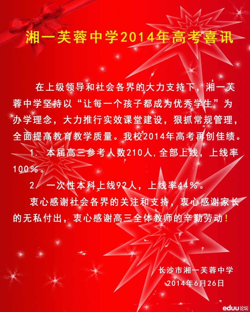 【查看原帖并参与讨论:湘一芙蓉中学2014年高考喜报】