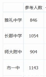 2014年长沙四大名校的高考参考人数分别为:雅礼中学846人,长郡中学1054人,师大附中904人,市一中1143人。看了这个参考人数,就知道了,这又是场分子、分母之间的游戏而已。雅礼可能只有800多人吗?师大附中900人?怎么可能呢?