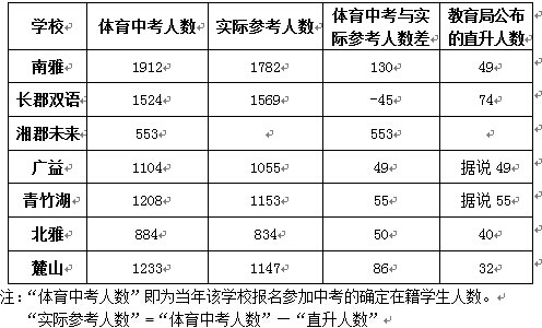 此表中,南雅、广益、青竹湖、北雅、麓山等学校实际参考人数与体育中考人数有一定差距,这个正常,因为这些学校都有直接对应某些学校或本校的直升生,人数减少势在必然。