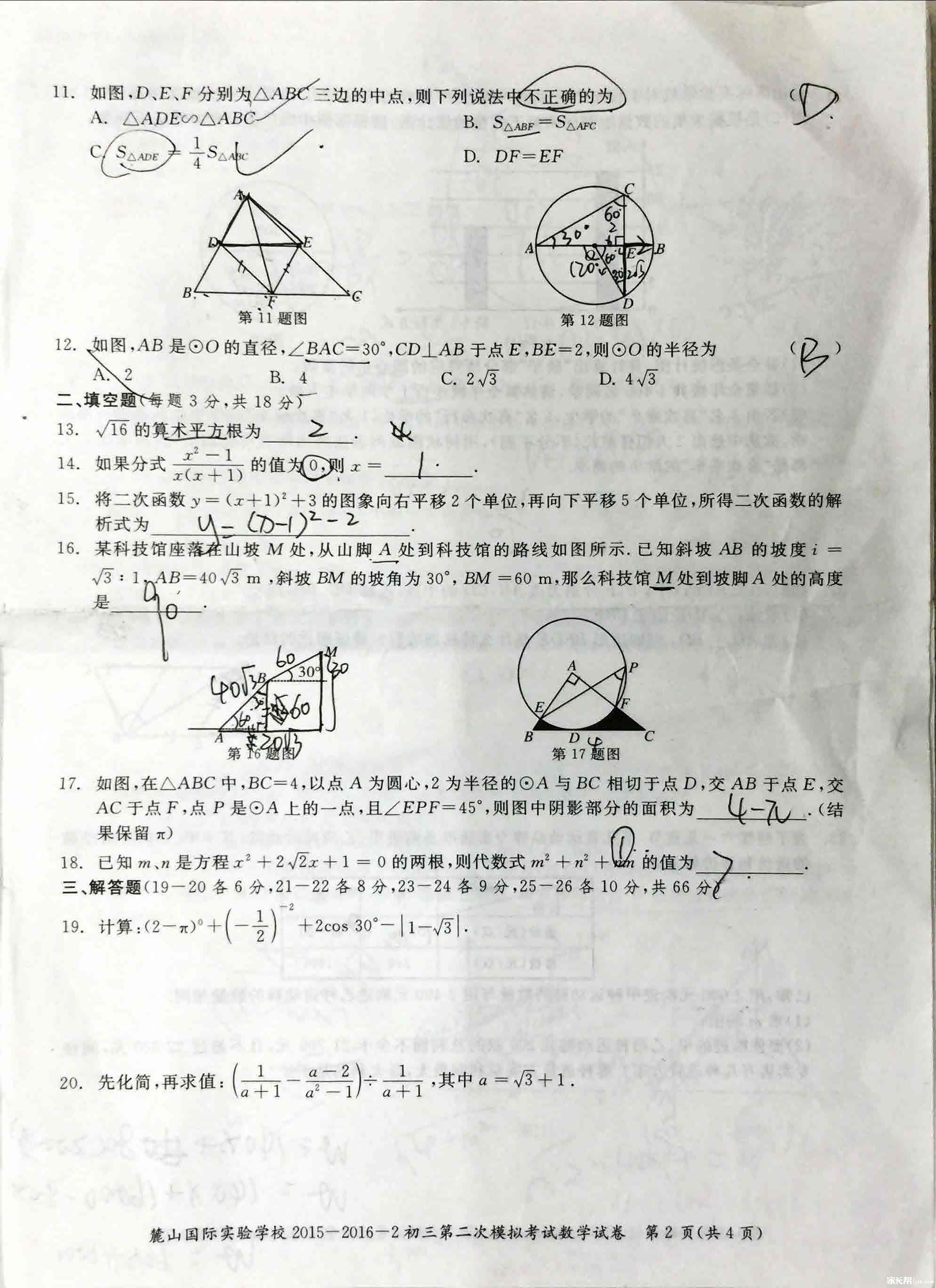 2016年长沙麓山国际中考二模数学试题答案(2)