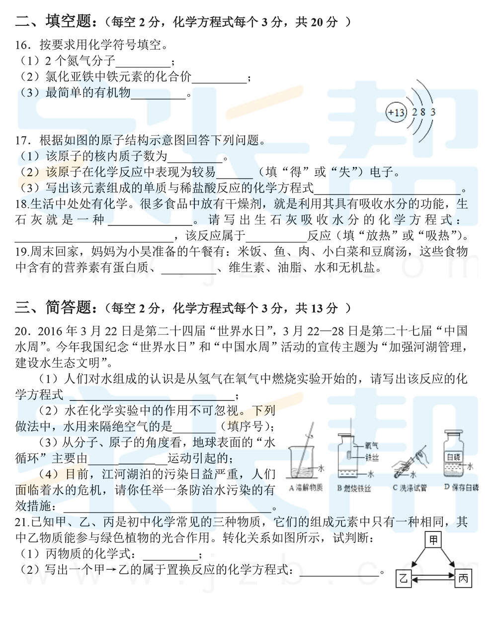 2016年长郡中学新高一分班考试化学试题(3)