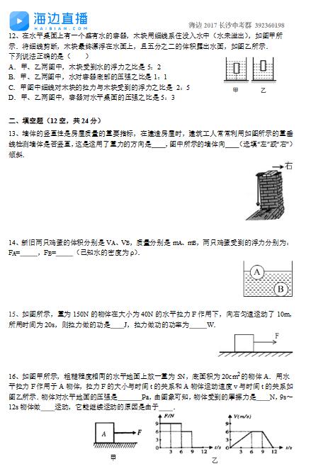 2016年长沙雅礼实验中学入学考试物理试题(3)