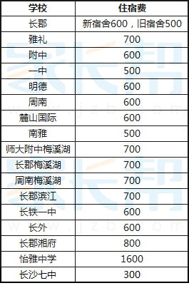 对于要住宿的孩子来说,长沙大部分高中都提供了住宿,学校根据宿舍的实际情况来划定学校住宿收费。一般高中学校每期的住宿费在500-800元之间,下面是在论坛收集到的一些学校的住宿费。(数据来源论坛家长,如有错漏请指出。)