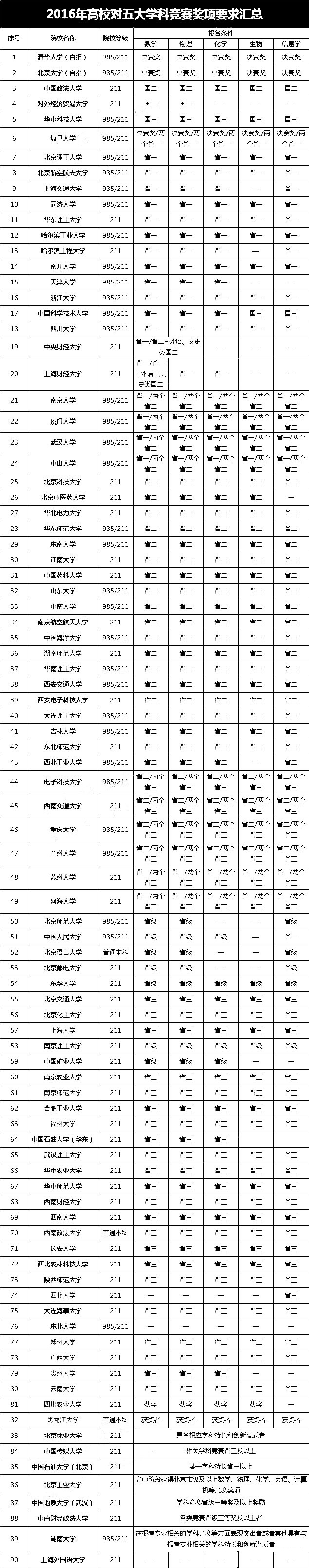 为方便大家及时查询及了解,统一整理了2016年高校自主招生对五大学科奥赛奖项要求,大家可以针对本文中内容大致定位自己的目标高校。