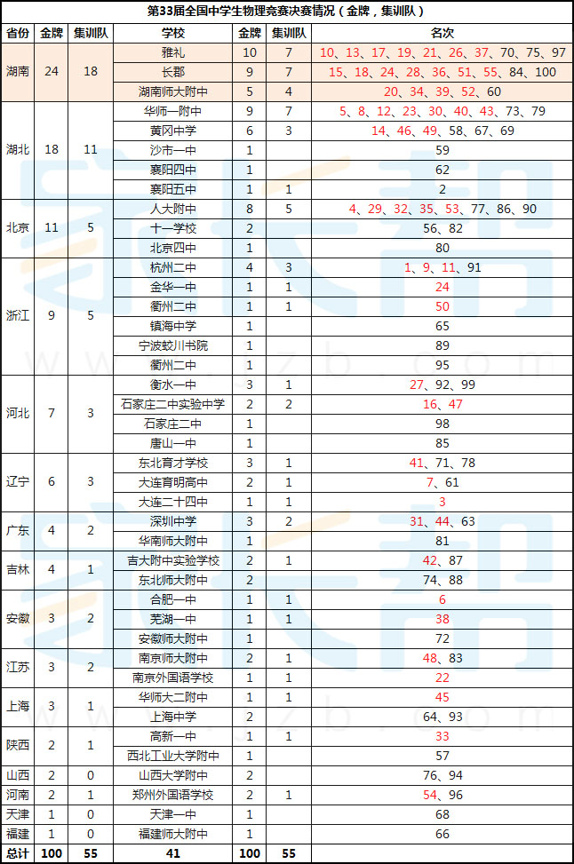 11月2日,2016第33届高中物理决赛暨冬令营正式在黄冈中学落下帷幕,本次全国物理竞赛决赛最终确定金牌100人,银牌122人,铜牌138人。在获得金牌100人中的前55名,进入国家集训队。其中,无论是金牌人数还是国家集训队的人数,湖南省队均位列第一!