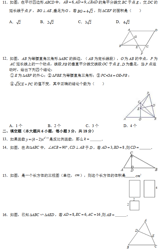 2016-2017学年长郡教育集团初三期中考试数学试题(3)