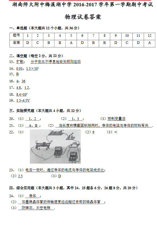 2016-2017学年湖南师大附中梅溪湖中学初三期中考试物理试题答案