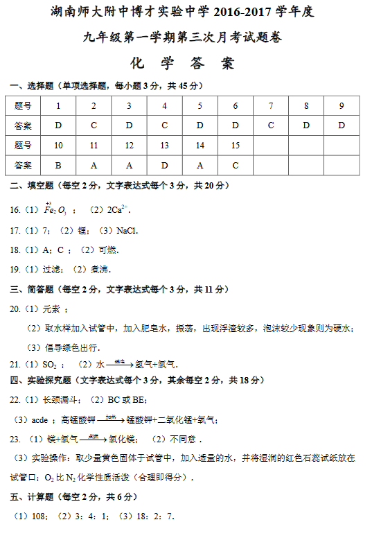 2016-2017学年湖南师大附中博才实验中学初三期中考试化学试题答案