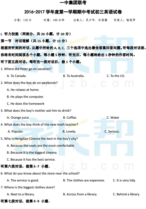 2016-2017学年长沙一中集团联考初三期中考试英语试题