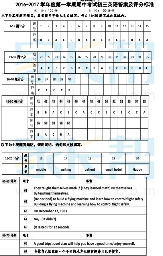 2016-2017学年长沙一中集团联考初三期中考试英语试题答案
