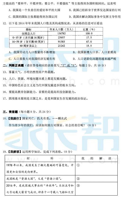 2016-2017学年长沙一中集团联考初三期中考试政治试题(3)