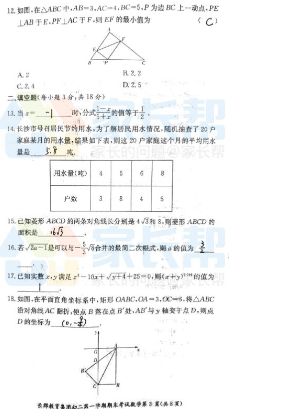2016-2017学年长沙长郡集团初二期末考试数学试题(3)