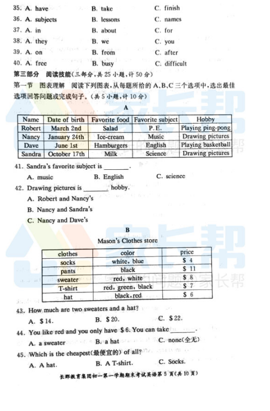 2016-2017学年长沙长郡集团初一期末考试英语试卷(5)
