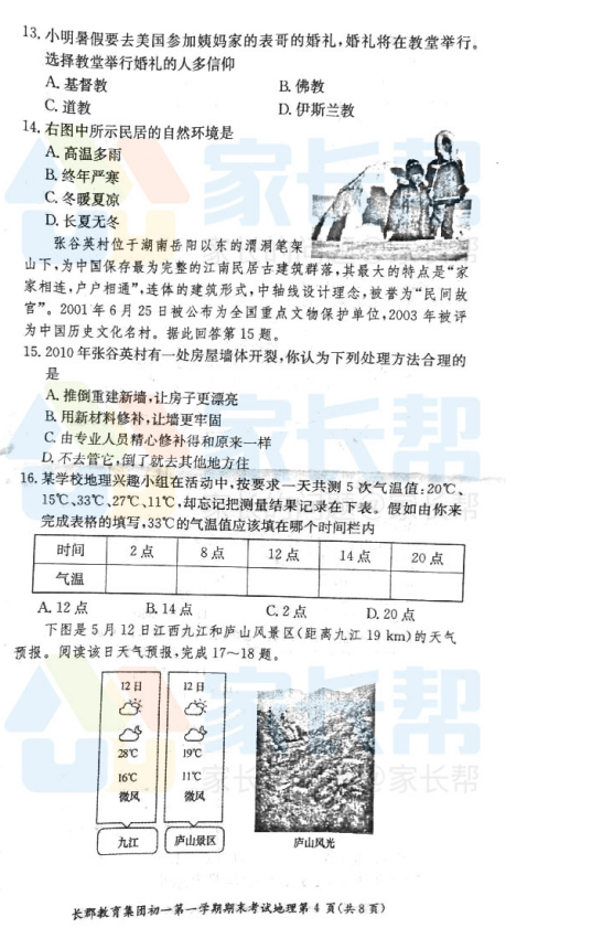 2016-2017学年长沙长郡集团初一期末考试地理试卷(4)