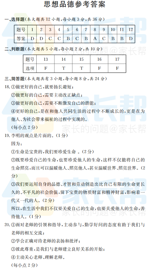 2016-2017学年长沙长郡集团初一期末考试政治答案
