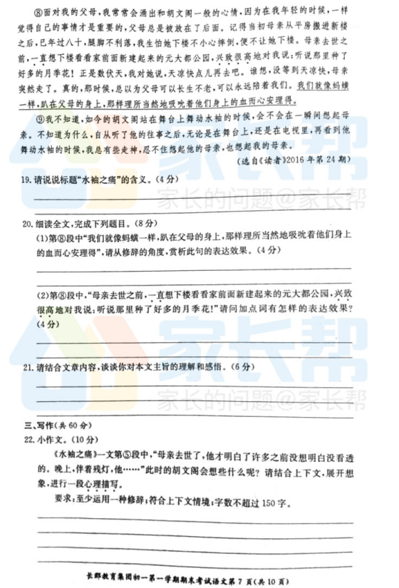 2016-2017学年长沙长郡集团初一期末考试语文试题(7)