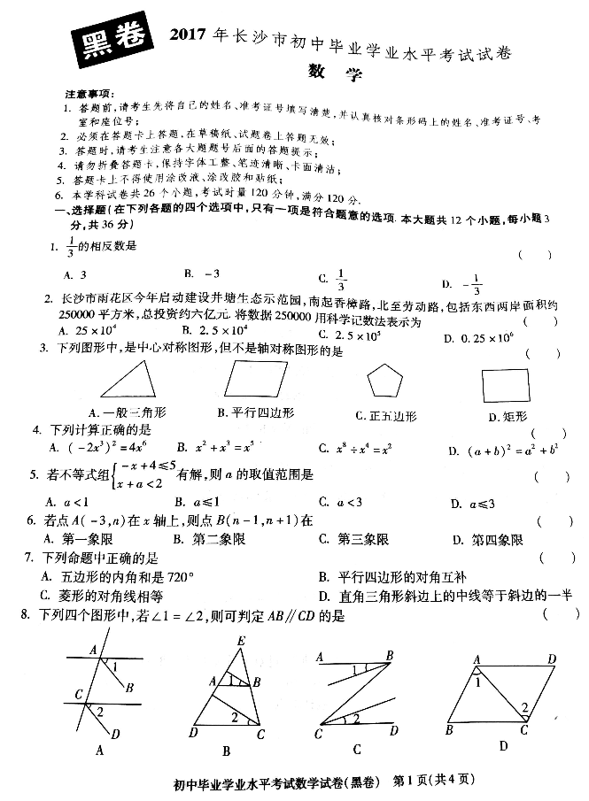 2017年长沙初中毕业学业考试数学试卷(黑卷)