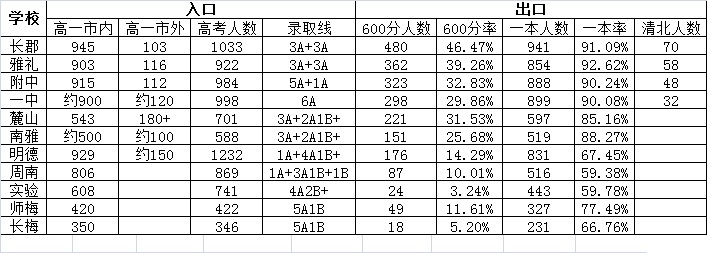 麓山、南雅:两校录取线并不低,且无指标生扶贫计划,一本率反而低于一附,清北人数比四大也相差有点远。