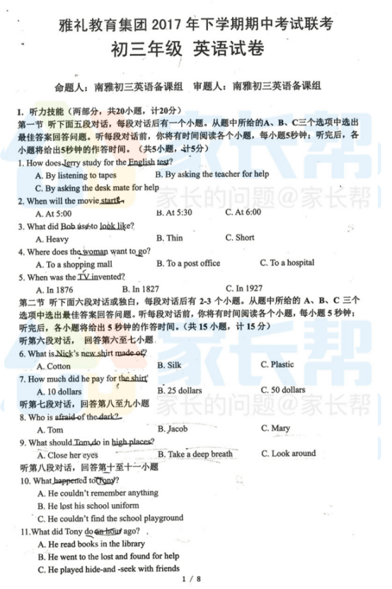 2017年秋季雅礼集团初三期中十五校联考英语试卷