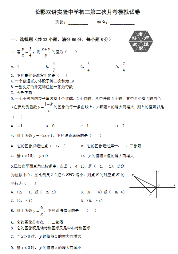2017-2018学年长郡双语实验中学九年级期中考试数学试卷