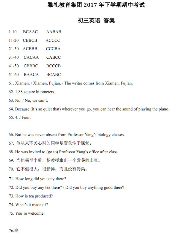2017年秋季雅礼集团初三期中十五校联考英语试卷答案